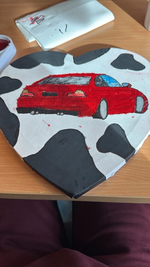 Wat heb ik gemaakt: Een schilderijtje voor mijn vriend met een BMW en koeien vlekken.