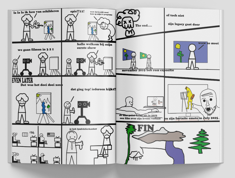ik vont de bo opdacht echt leuk je moest een comic maaken van een kunstenaar en ik heb bob ross gekozen ik heb deze opdracht gemaakt in illustrator