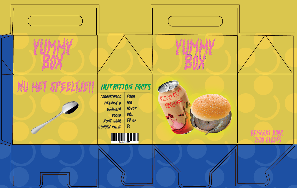 bij printen en na bewerken heb ik een verpaking gemaakt in illustrator hij is nog niet af maar hier is de template