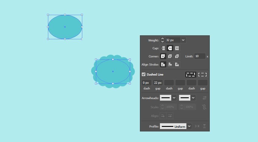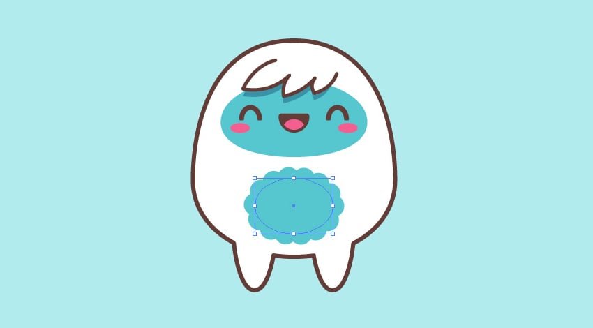 Laten we de buik creëren. Maak eerst een ellips met behulp van de Ellipse Tool (L) met Breedte: 112px en Hoogte: 80px. Vul het met dezelfde blauwe kleur als het gezicht. Omtrek het dan met dezelfde kleur met een 32 pt Slaggewicht en Ronde Cap. . Check Gestreepte lijn, binnenkomen 0 pt in dash, en 22 pt in gap. Hierdoor ontstaat een geschulpte rand.