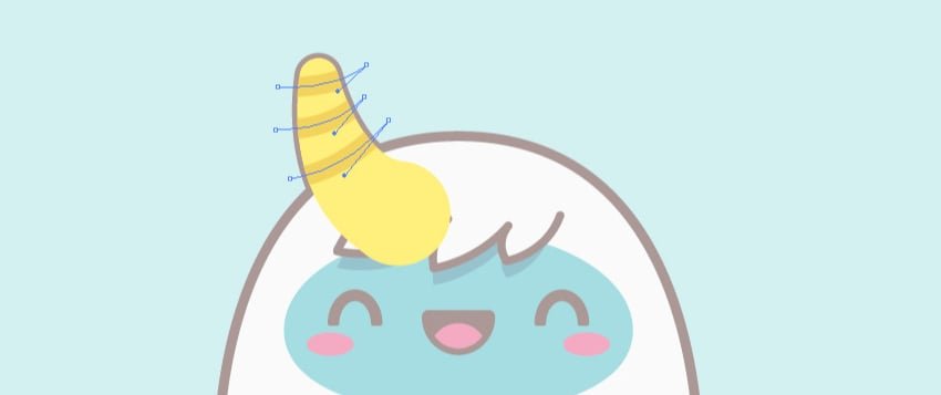 Dit monster heeft wat hoorns nodig. We kunnen ze op dezelfde manier maken als de armen, met de Breedtegereedschap (Shift-W). . Gebruik maken van de Pengereedschap (P), teken een gebogen lijn en strijk deze met geel en 3 pt (R=255, G=240, B=104). Met de Breedtegereedschap (Shift-W), vergroot beide punten als volgt