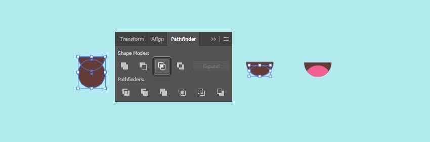 Selecteer nu de halve cirkel en de ellips. In de Pathfinder, klik Intersect. . Vul de tongvorm met een roze kleur (R=238, G=96, B=146).
