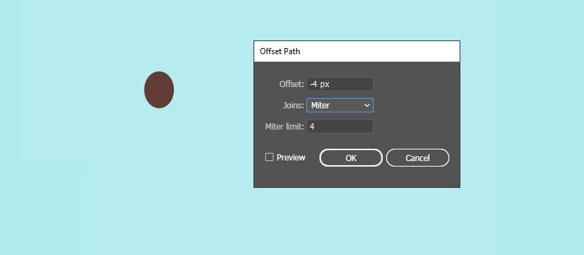 Nu op naar de ogen. Maak een ellips met behulp van de Ellipse Tool (L) met Breedte: 30px en Hoogte: 38px. . Vul hem met dezelfde donkerbruine kleur. Selecteer de ellips en ga naar Object > Pad > Offsetpad. . Enter -4 px in Offset en raak OK.